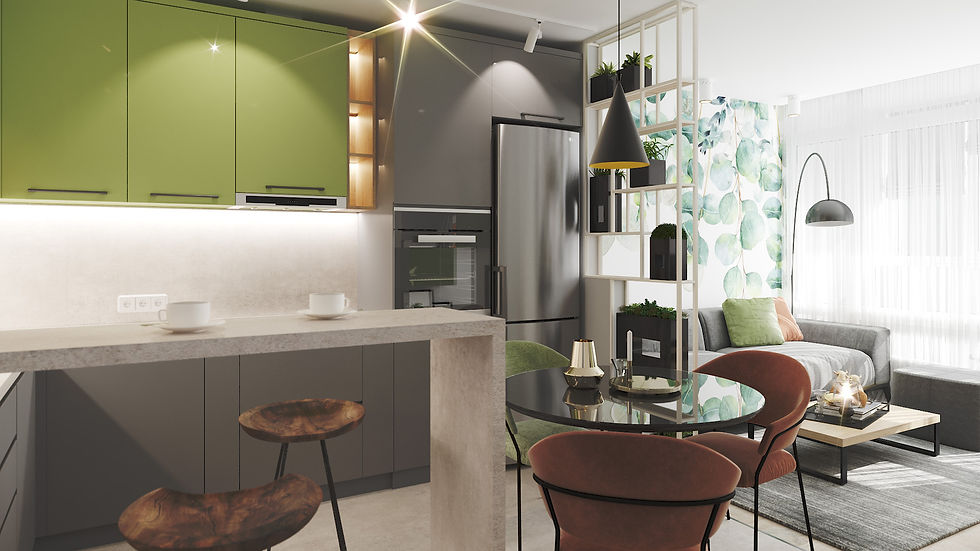 В небольшом помещении 20 м² стояла задача разместить и гостиную - место для отдыха, и обеденную зону - кухню. И барную стойку, и обеденный стол. И обязательное место для цветов и растений. Поэтому была смоделирована декоративная стенка, которую хозяйка украсит цветами, и которая, так же, будет служить элементом зонирования.